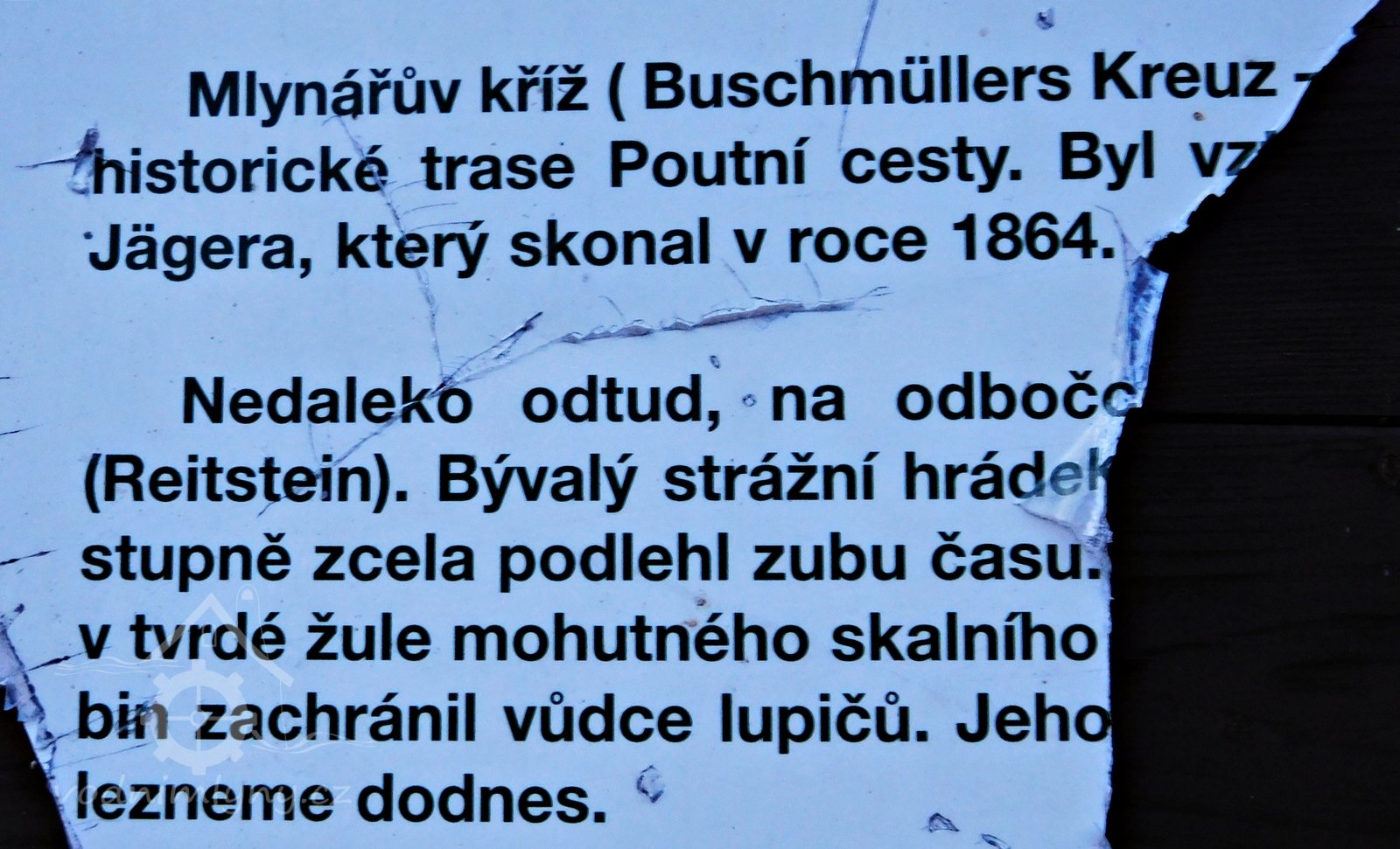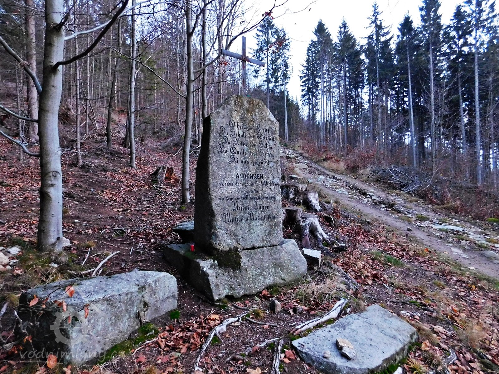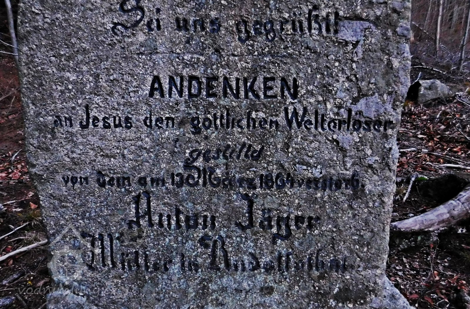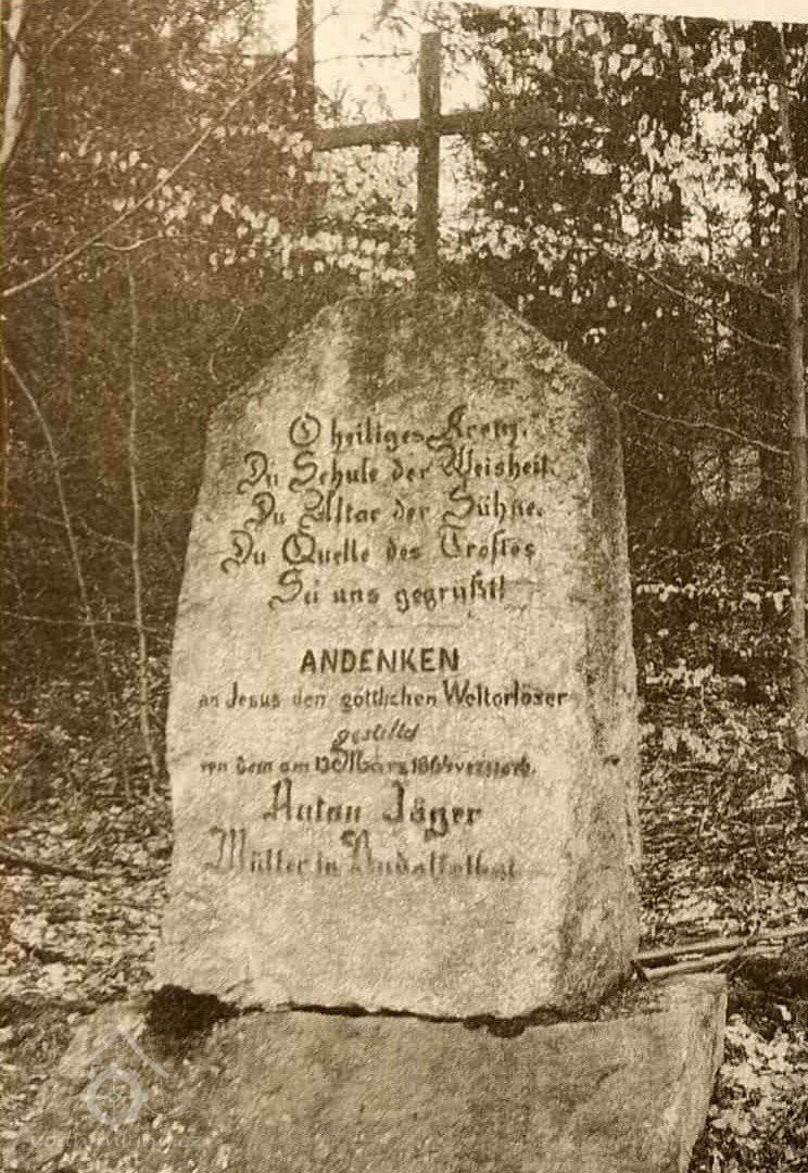 · V Jizerských horách u křižovatky cest na Žulovém svahu nad údolím Černé Nisy stojí kříž. Připomíná místo, kde 13. března 1864 zemřel mlynář Anton Jäger z Rudolfovského mlýna (někdy také Buschmühle - podle německého jména obce), připomínaného v údolí Černé Nisy již v 17. století.