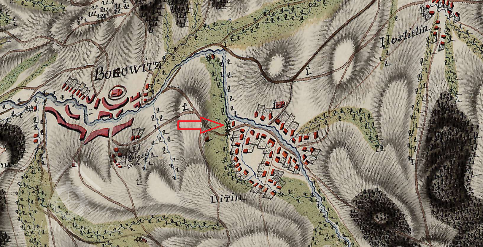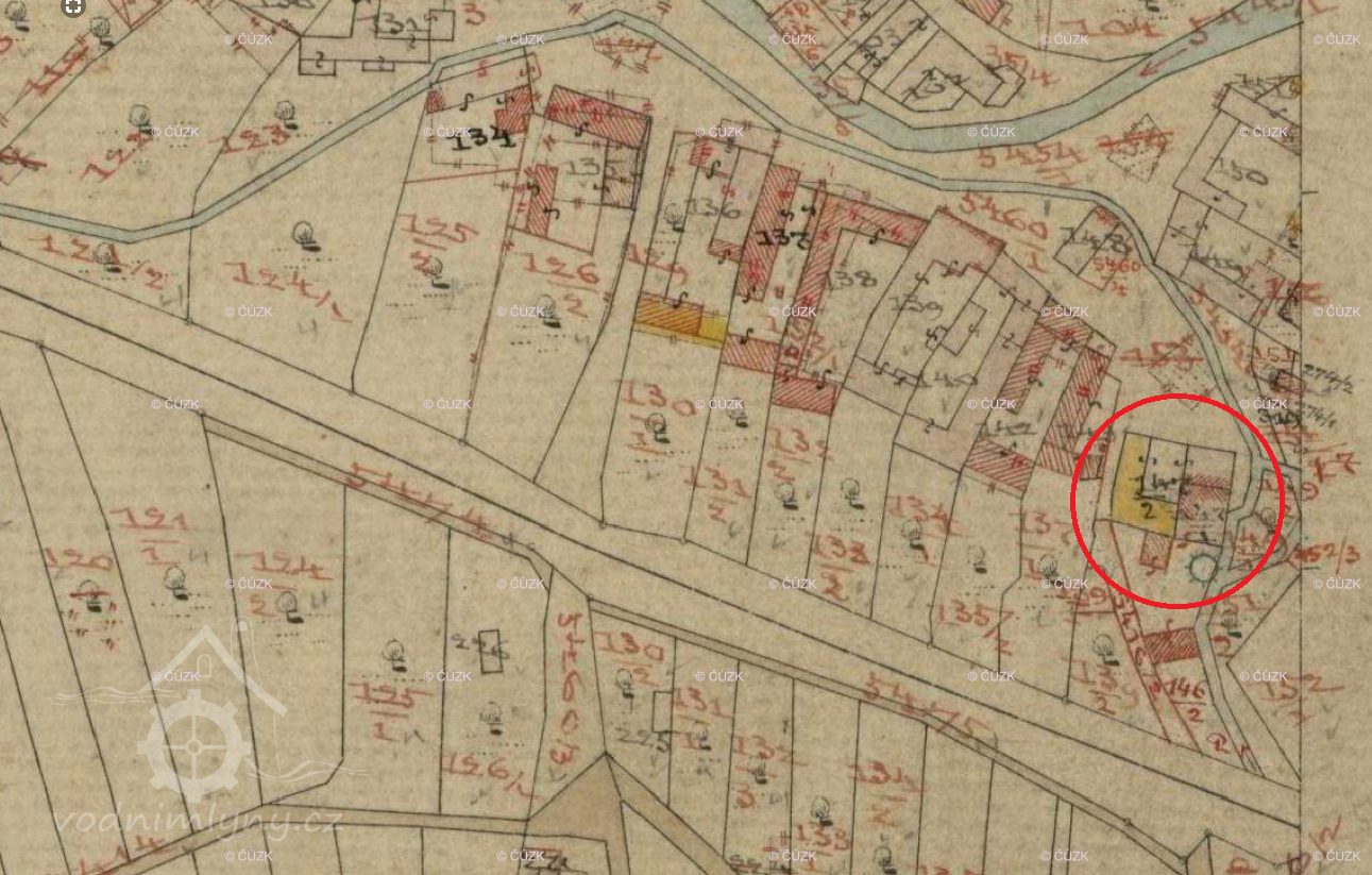 Podle současného majitele domu Josefa Spáčila byl mlýn postaven za domem Č. 57 (Spáčilovi).