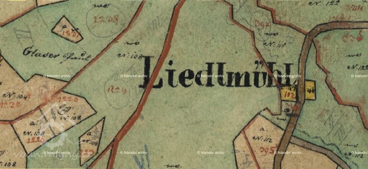 Na mapě Stabilního i Pozemkového katastru je uveden název "Liedlmühl".V období 1826-1945 byl mlýn a další stavby v majetku rodiny Pflanzer,posledními vlastníky byli od r.1925 do r.1945: Jakob Pflanzer ml. a Theresia Pflanzer.