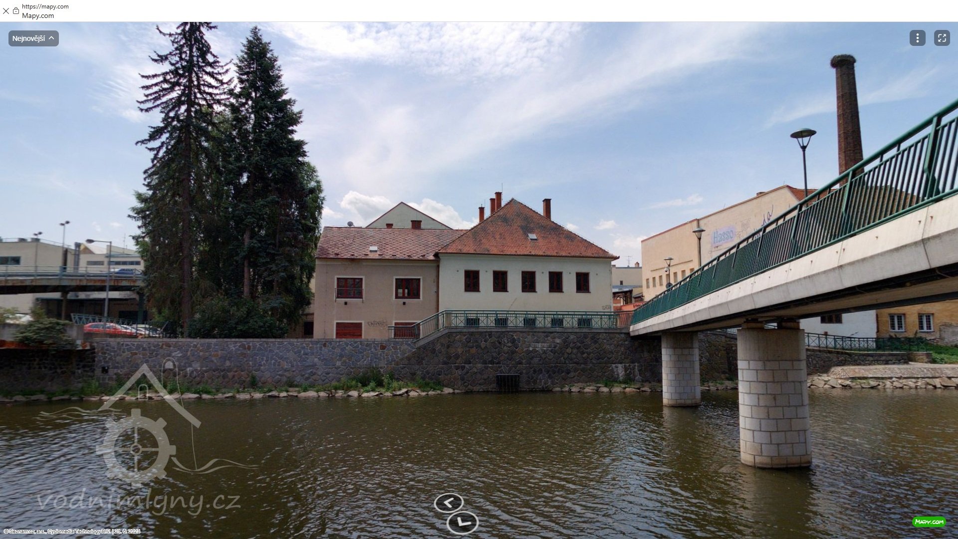 Pohled na bývalou valchu a mlýniště přes řeku, 06 2023, © mapy.cz