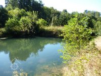 přístupová cesta z hráze, vpravo v křoví pod hrází zbytky náhonu, dle kat. mapy. tudy vedl dříve i náhon z rybníka, VIII./2016, © Kozel