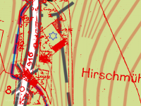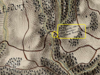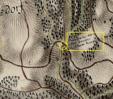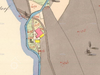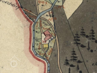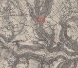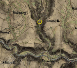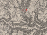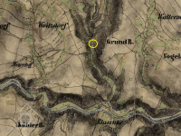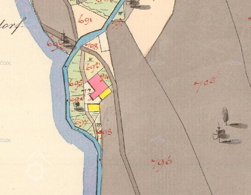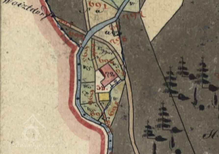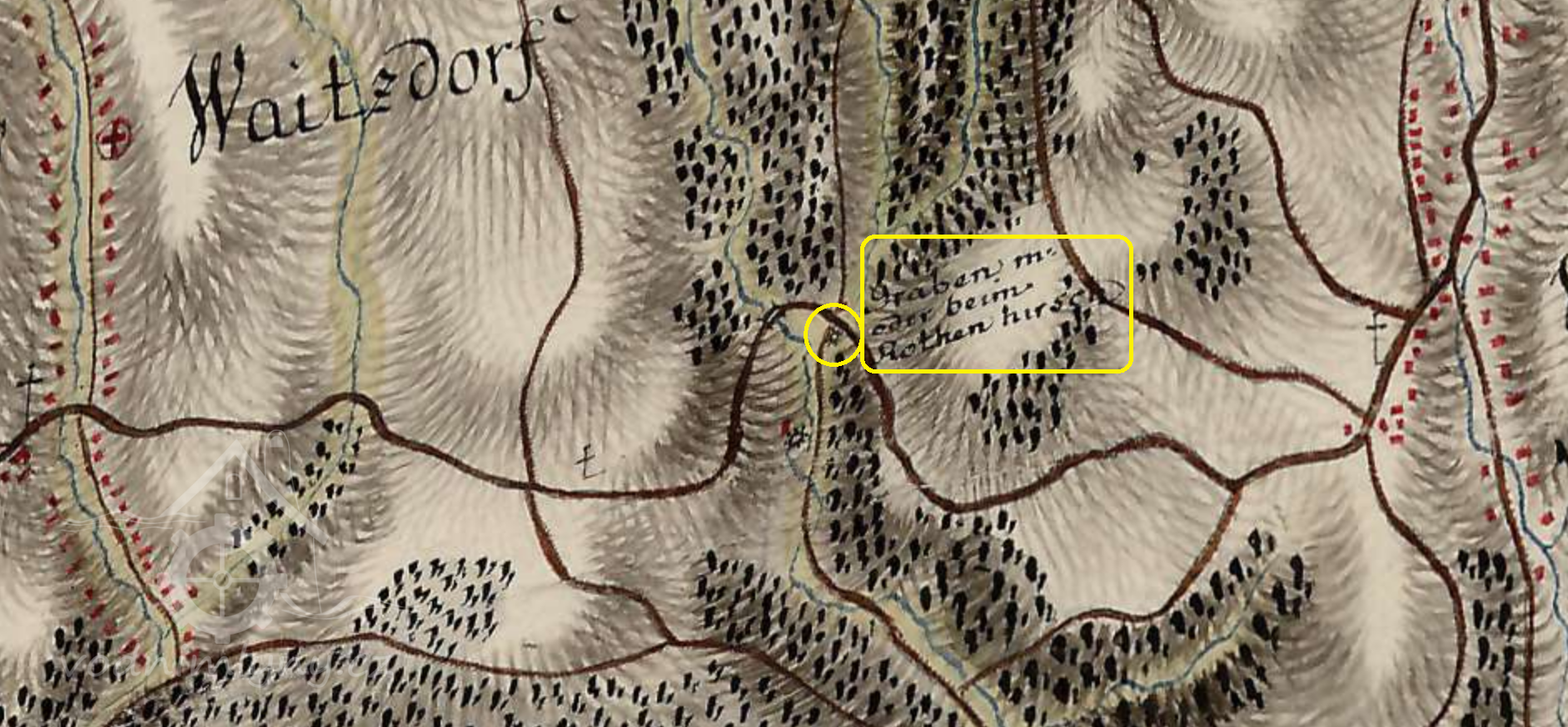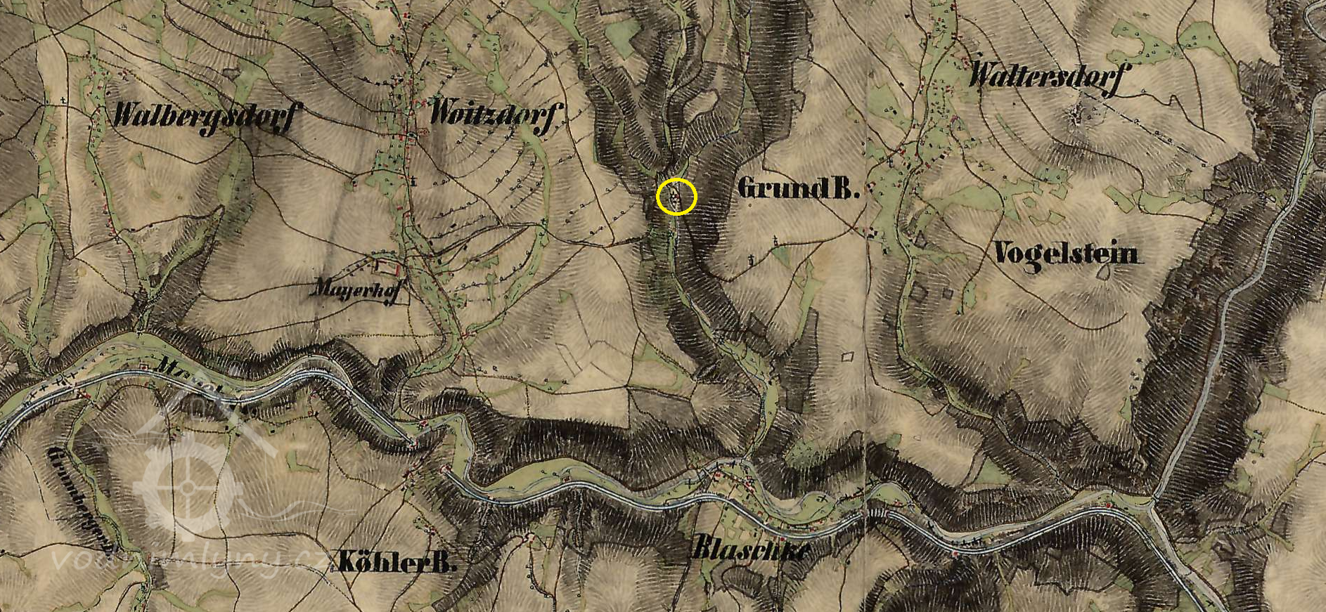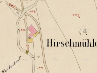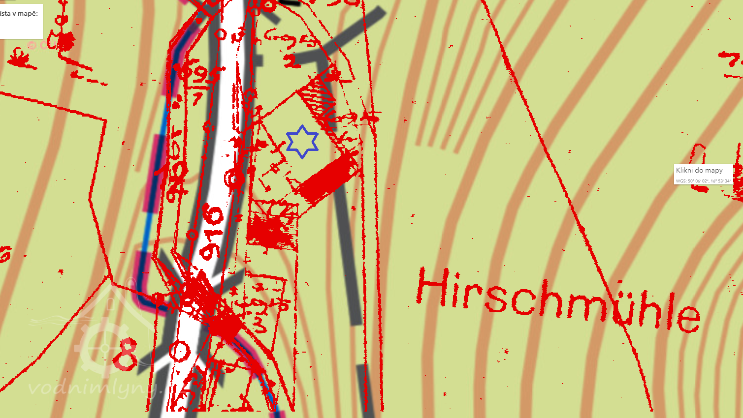 Na mapě I. voj. mapování: Graben m. oder bei Rothen Hirsch (Příkopní mlýn neboli U Červeného jelena)