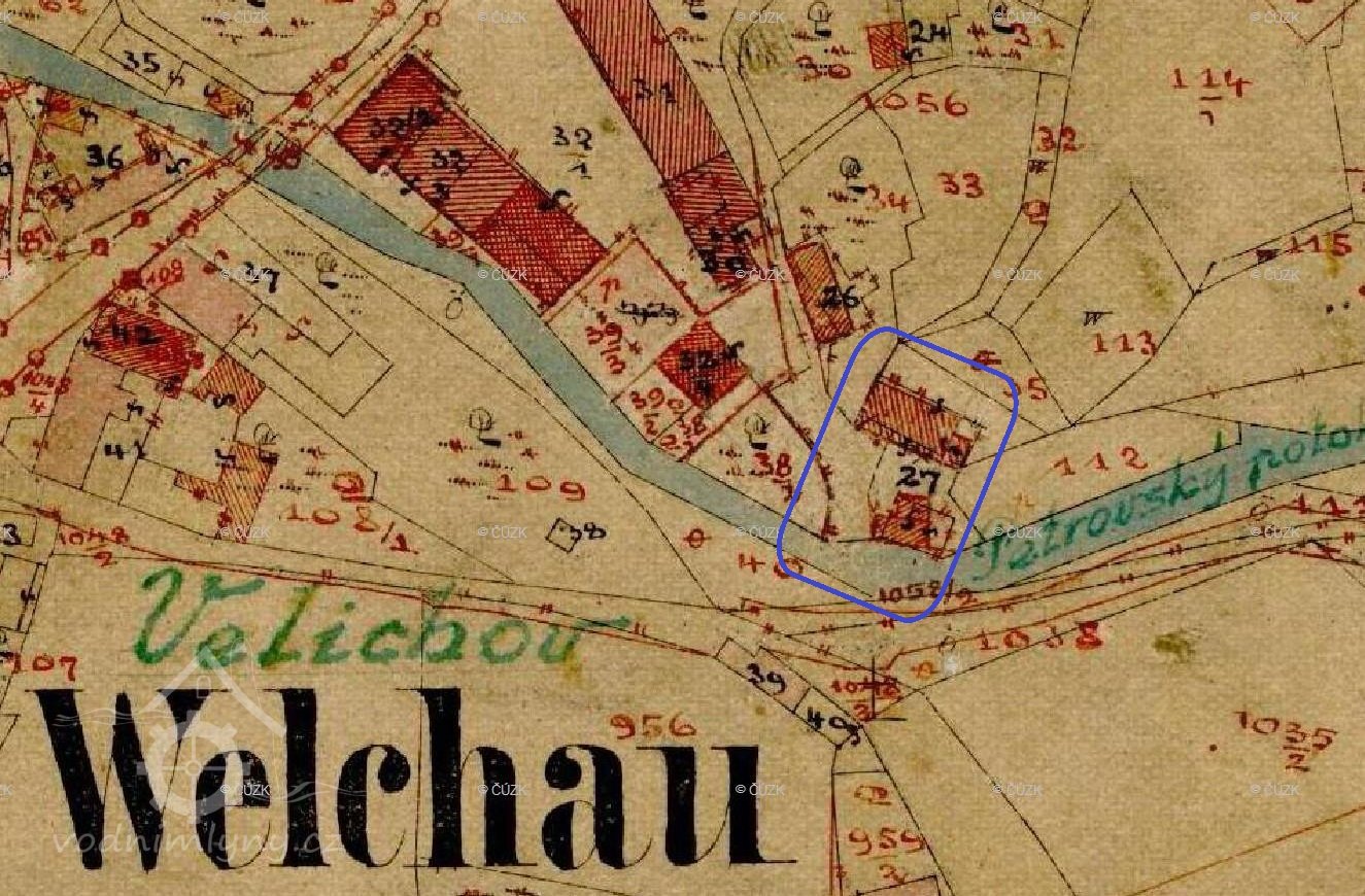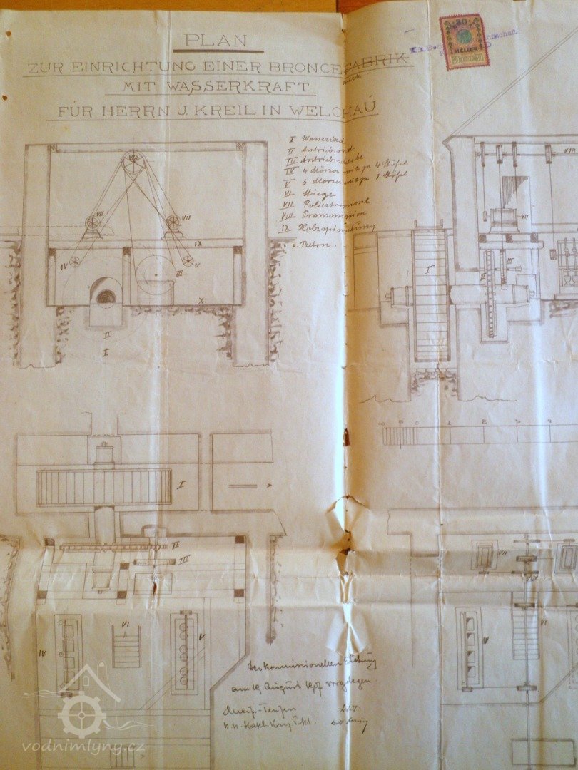 Já podepsaný Johann Kreil, majitel mlýna ve Velichově čp. 66, tímto zdvořile oznamuji, že vzhledem k tomu, že mletí již nebylo rentabilní, jsem z mého mlýna odstranil vnitřní mlecí zařízení a nahradil jej malým drtícím zařízením sestávajícím z 10 hmoždířů s 22 paličkami a 2 lešticími bubny, a tímto hodlám vyrábět kovové bronzy.