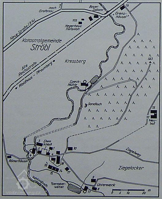 Místo, kde stával nejstarší hamr, který po úpravě hranice připadl po roce 1362 k Čechám, můžeme zcela hypoteticky klást do míst tzv. Nového mlýna Zatímco Specknerův mlýn leží za Hraničním potokem na německé straně, zbytky Nového mlýna nalezneme jen kousek odtud na české straně. Provoz který byl před zánikem nazýván Novým mlýnem, má rovněž pestré dějiny, které by si zasluhovaly hlubší historickou studii. Schematické vyobrazení střebelského hamru přináší mapa Tobiase Schubharda z roku 1629 zachovaná v kopii z roku 1763. Na mapě zemské hranice u Waidhausu z roku 1706 byla lokalita s hamrem, položená na falcké straně hranice, nazývána Ober Ströbl. Ležela na samostatné cestě směřující z Horní Falce do Rozvadova. V té době zřejmě dosahovala stejného významu jako Dolní - Česká Střeble, kde se nacházel dvůr se sídlem majitelů statku. Situace na mapě z roku 1706 názorně zobrazuje vodní náhon, který se pod Horní - Falckou Střeblí odděluje od Hraničního potoka a směřuje do České Střeble. Na počátku tohoto koryta je na české straně zobrazena značka vodního provozu, kterou můžeme ztotožnit s pozdějším Novým mlýnem.