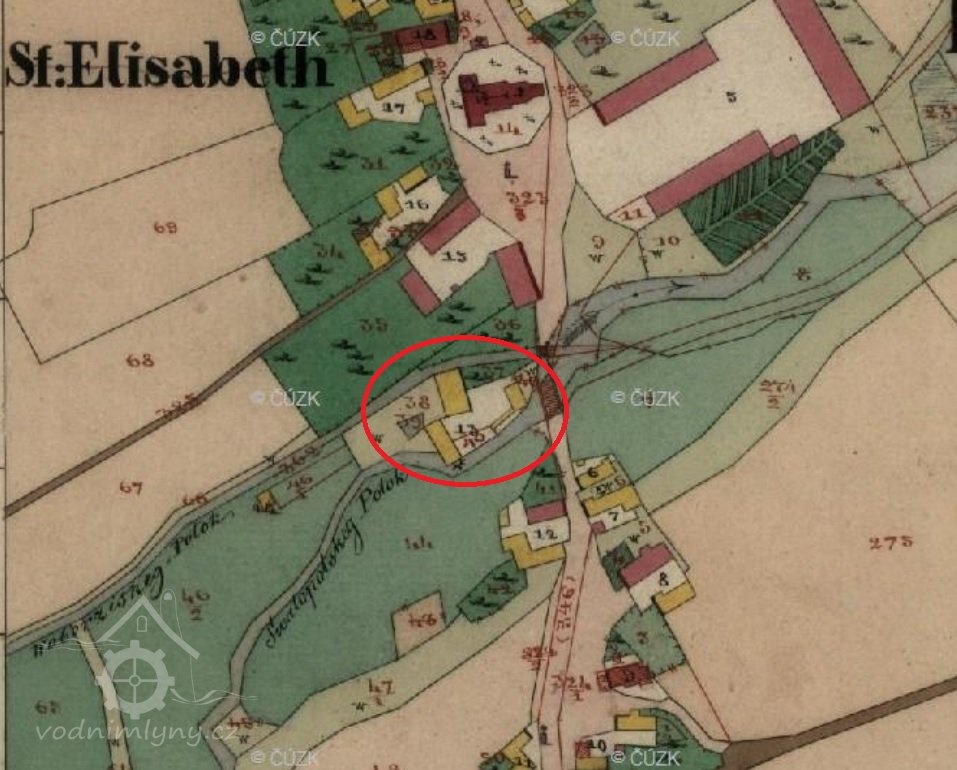 PopisV r. 1930 zde byla 2 kola na svrchní vodu, průtok 0,127 m3/s, spád 4,5 m, výkon 8,69 k.