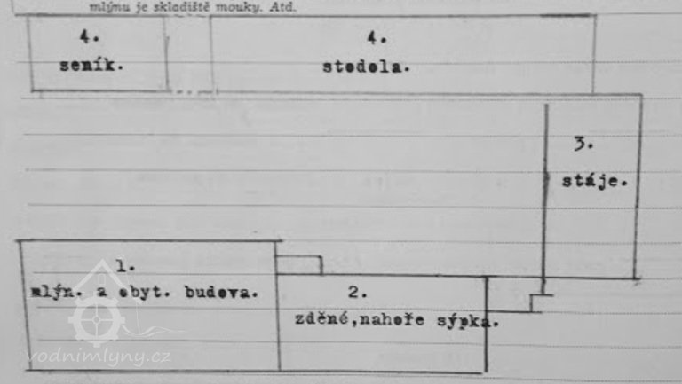 mlýnská budova 24 m dlouhá, 18 m široká, 11 m vysoká, zděná, v části 13 x 12 m mlýnice, 11 x 12 obytné místnosti v přízemí a I. patře, nad nimi v podkroví sýpka. V sousední budově 14 m dlouhé a 8 m široké zděné v přízemí místnosti pro zaměstnance, v podkroví též sýpka 12 x 8 m. Na obě sýpky dopravuje se obilí po schodech v pytlích, dolu též. Ve mlýnici na dolní podlahu možno uložiti obilí v pytlích, na podlaze válcové též mlýnské výrobky v pytlích, mimo to možno ve dvou reservátech u míchačky uložiti volně 70 q v míchačce 80 q mouky.
