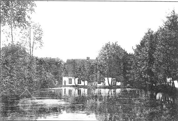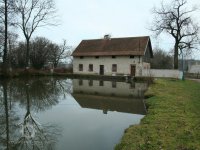 Drobný vesnický mlýn trojdílného půdorysu na nestálé vodě (pod hrází malé nádrže).