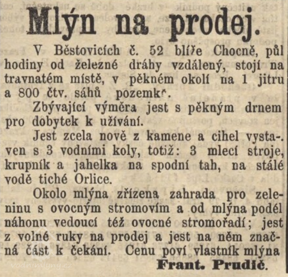 V r. 1871 byl mlýn na prodej, mlynář František Prudič. (RR)