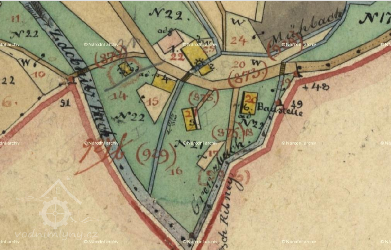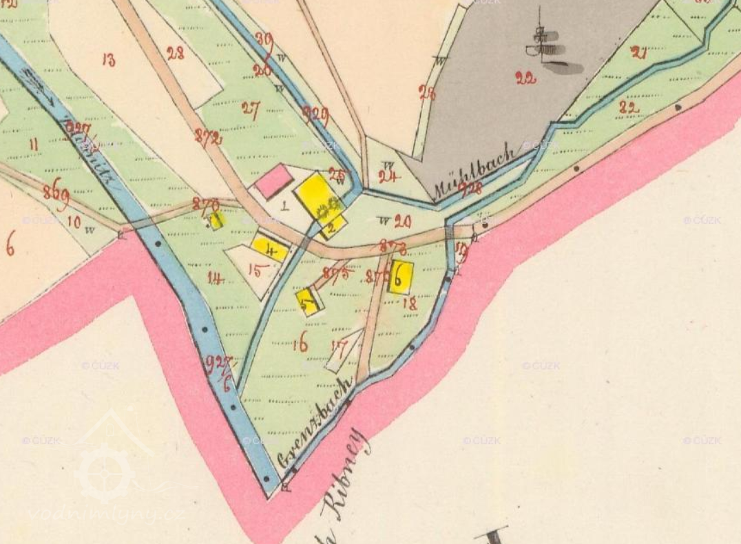 Popis1930: 1 kolo na svrchní vodu, hltnost 0,121 m3/s, spád 3,45 m, výkon 3,33 HP