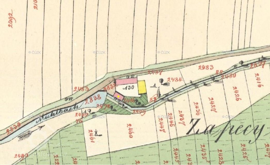 První nalezená zmínka o mlýnu pochází až z prvního Tereziánského katastru, z roku 1748, kde se píše: „1 mlynář na vlastním mlýně o 1 kole na nestálé vodě“.[iii] Existenci mlýna potvrzuje i vyobrazení na I. a II. vojenském mapování (obr. 2/21, 3/21).[iv] Detail dispozice mlýnského areálu poprvé zachycuje Indikační skica z roku 1841 (obr. 4/21). Mlýn a protilehlé stavení označuje skica červenou barvou jako nespalné. Třetí budova areálu má barvu žlutou - v době mapování tedy byla spalná. Jako majitele uvádí Indikační skica Antona Hnitku.[v] K roku 1938 vlastnil mlýn Václav Jerman, který jej převzal o šest let dříve od svého otce Jana. Za II. světové války mlynáře Václava Jermana někdo udal, že přechovává obilí a nemá přihlášené rádio. Jermana zatkli a dva a půl roku věznili v koncentračním táboře. Na konci války se pokusil znovu začít mlít, což se mu po několika zamítnutých žádostech podařilo.[vi] Mlýn pravděpodobně přestal pracovat okolo roku 1950 - jako většina malých mlýnů v Čechách.