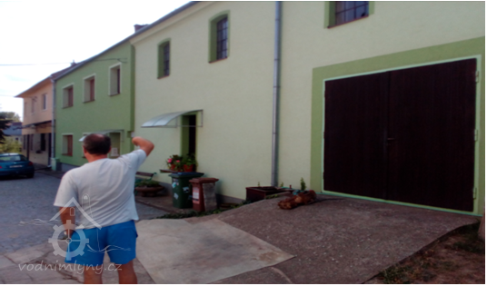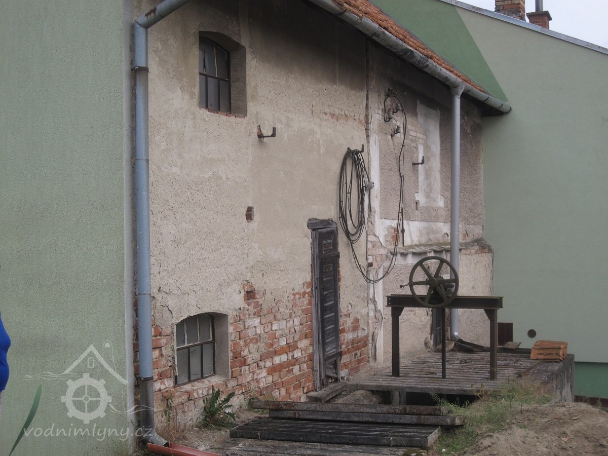 Západní, návodní zeď mlýna. Mezi dveřmi a stavidlem patrná stavební spára (svislý bílý pruh je nároží jižního dílu severní části dnešní budovy). Vpravo lednice, květen 2016, © Dušan Žatecký, (Prvky na obrázku: stavidlo, lednice)