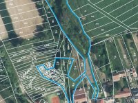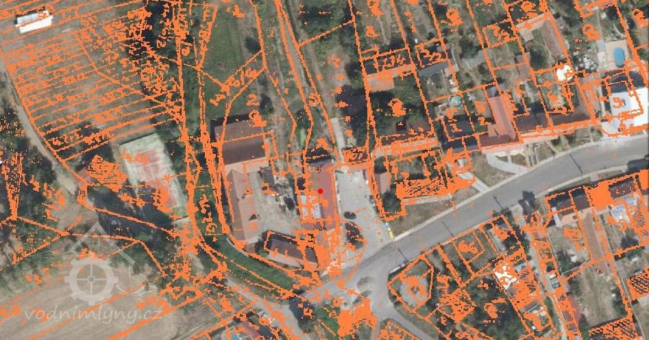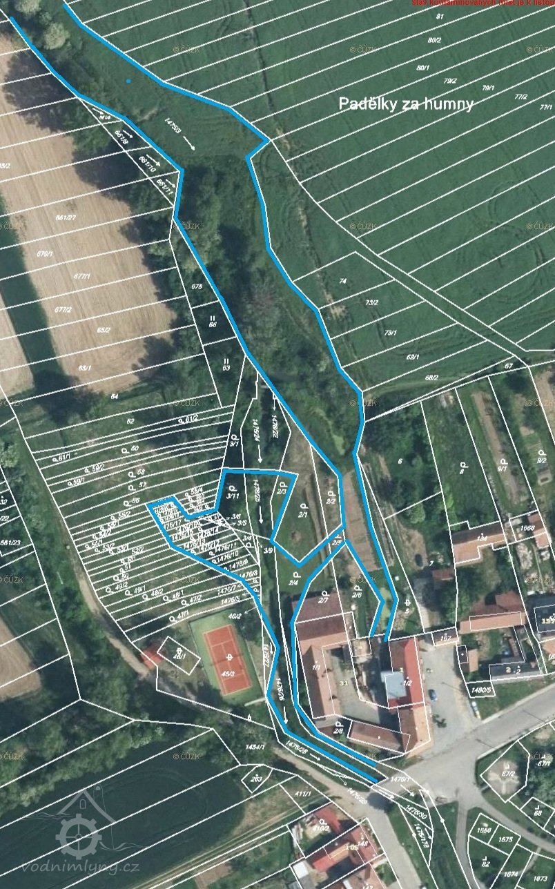 Letecký snímek s hranicemi parcel, mlýn a vodní dílo. Modře ohraničeny parcely dle Císařského otisku, dnes je koryto potoka výrazně užší a voda míjí mlýn přes jez, 2009, © http://kontaminace.cenia.cz/