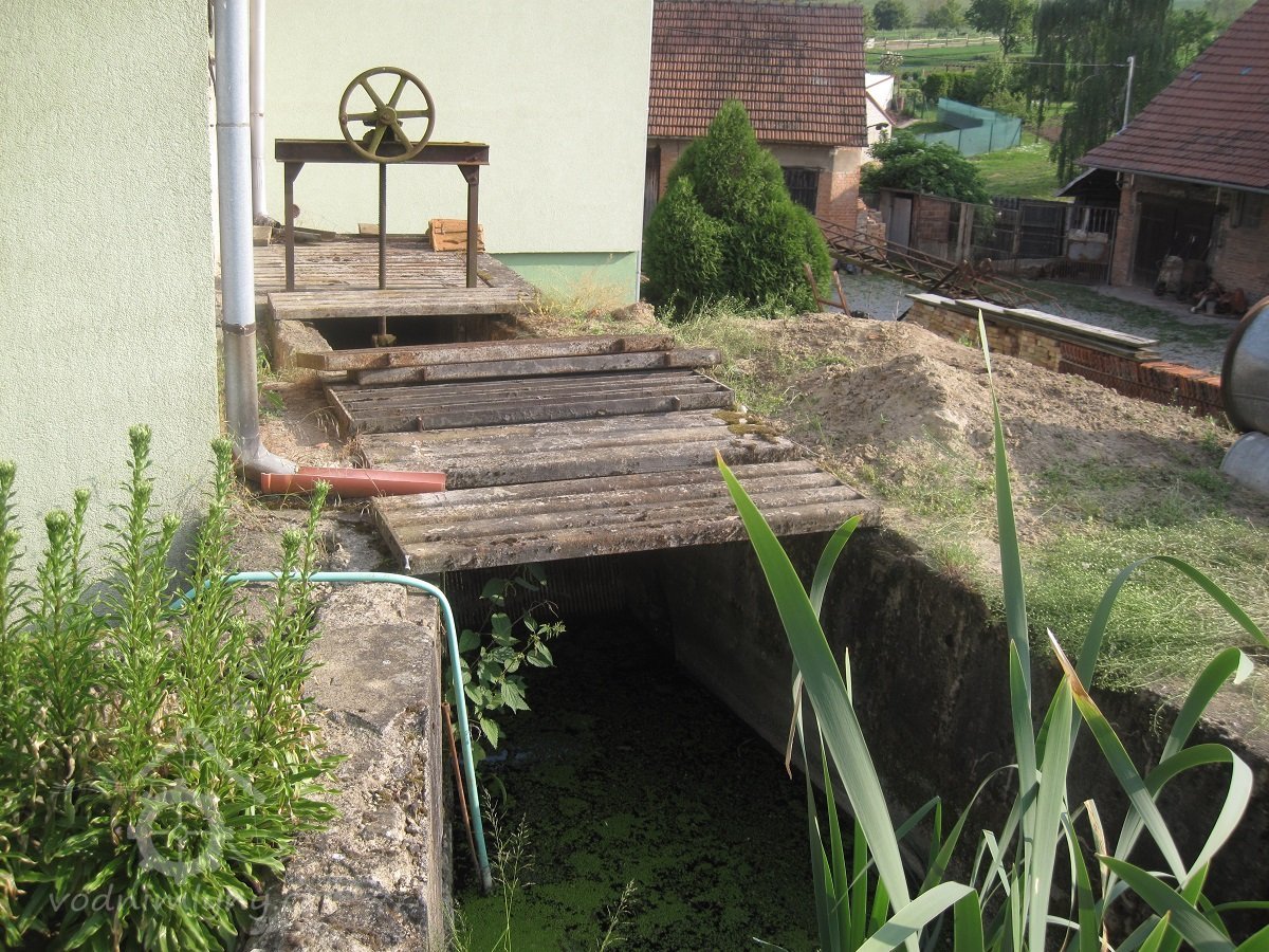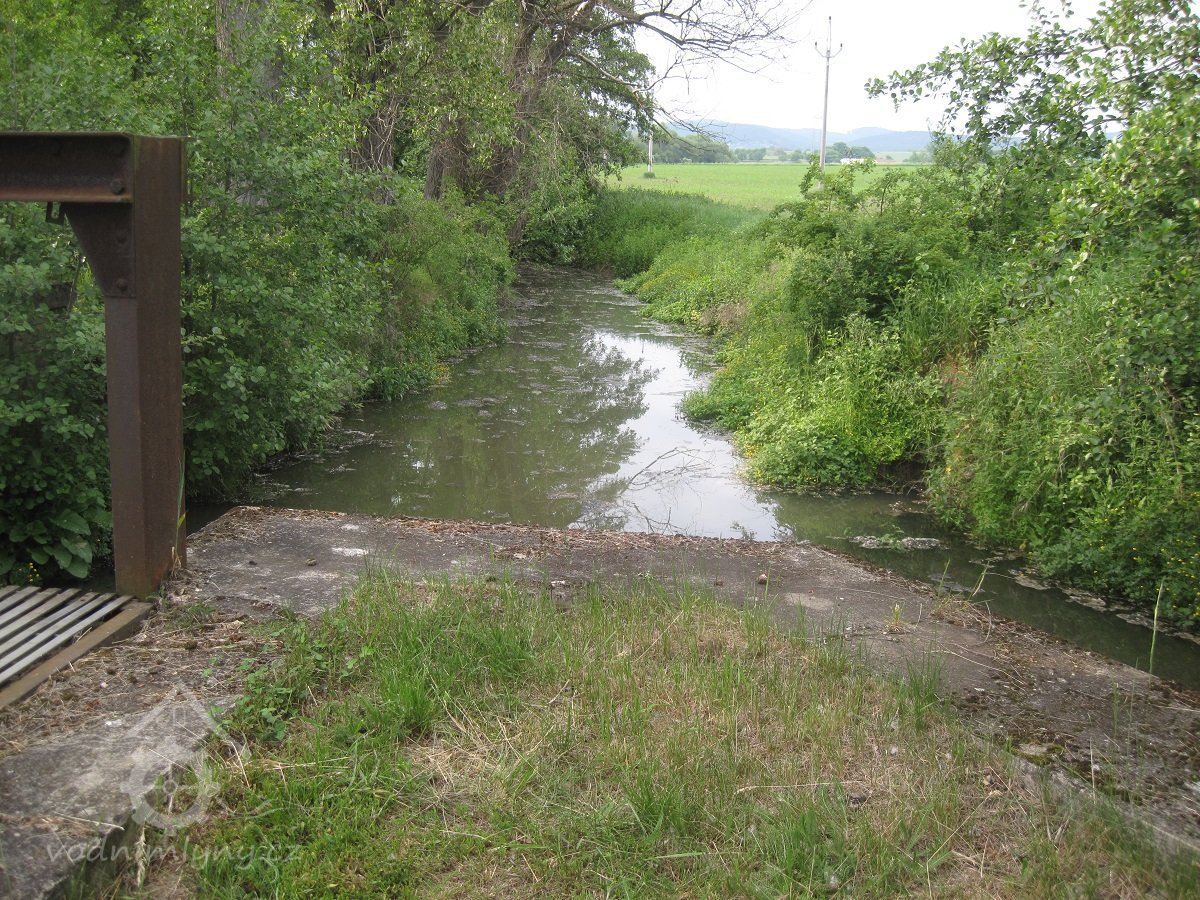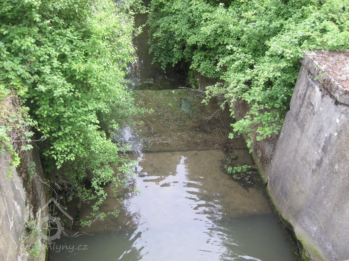 Betonové koryto přivádějící vodu k vodnímu motoru - a stavidlo před ním, květen 2016, © Dušan Žatecký, (Prvky na obrázku: náhon, stavidlo, vantroky)