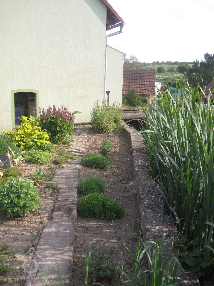 Pohled ze současného jezu k mlýnu. Mezi štítem mlýna (s valbičkou) a kmenem ovocného stromu patrná obdělaná plocha - tj. zasypaná část náhonu, květen 2016, © Dušan Žatecký