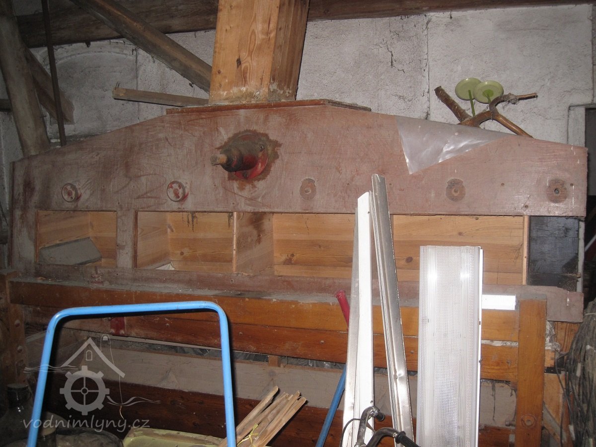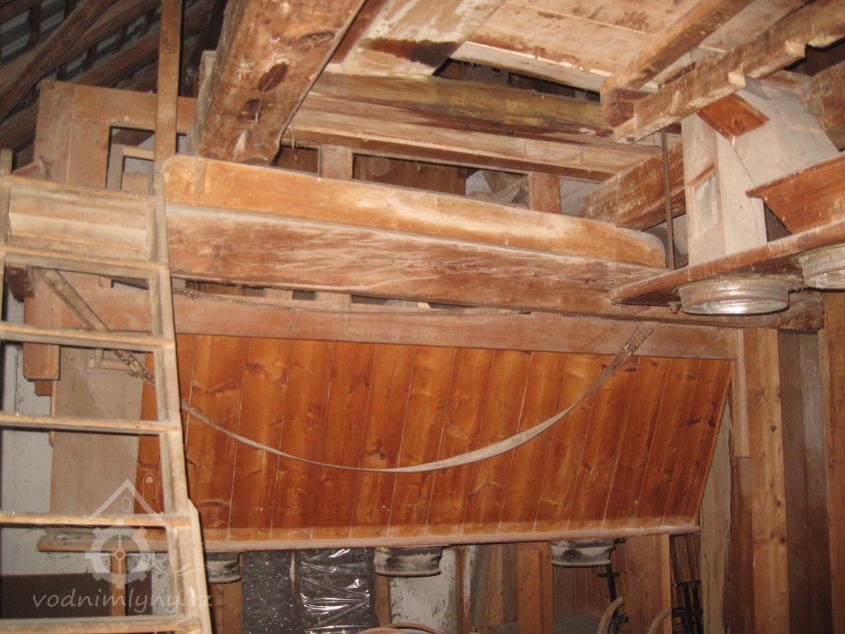 Patro jižního dílu severní části dnešní budovy, květen 2016, © Dušan Žatecký, (Prvky na obrázku: transmise, řemenice, převody)