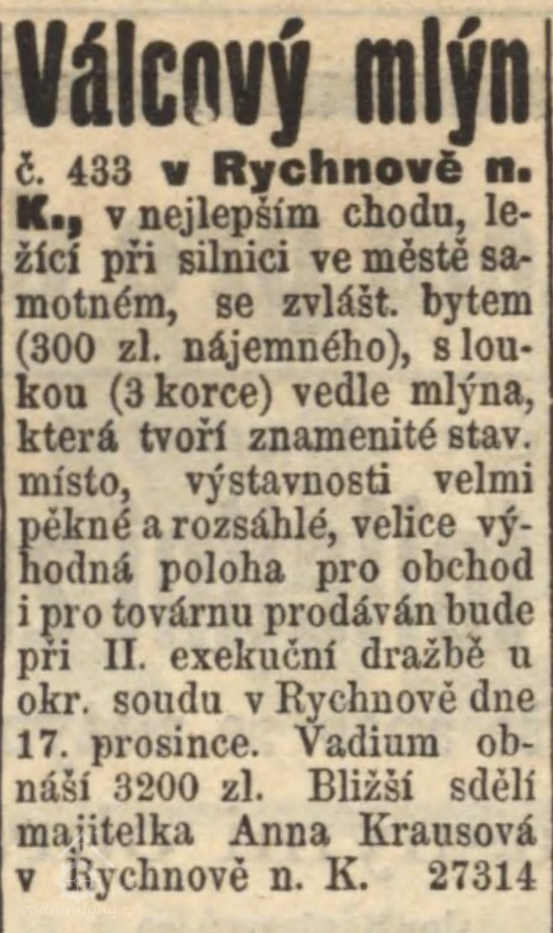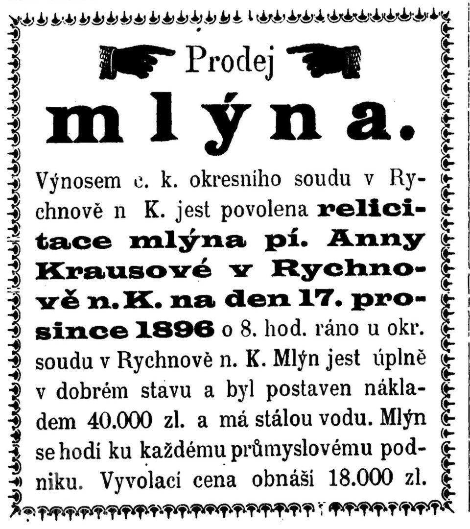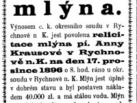 1896 dražba mlýna, majitelka Anna Krausová. (RR)