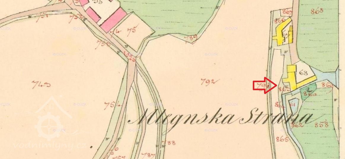 Popis1930: 1 kolo na spodní vodu, hltnost 0,133 m3/s, spád 3,96 m, výkon 4,54 HP