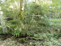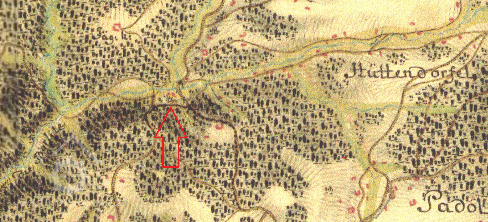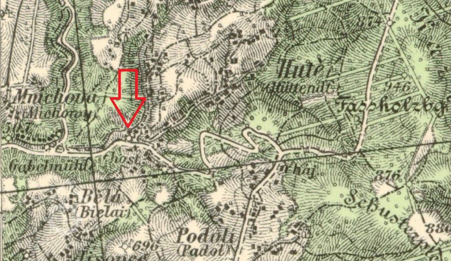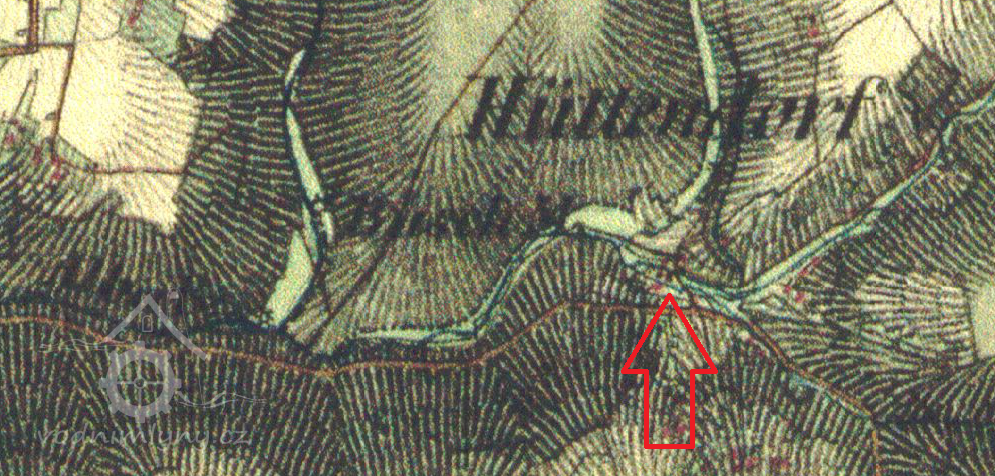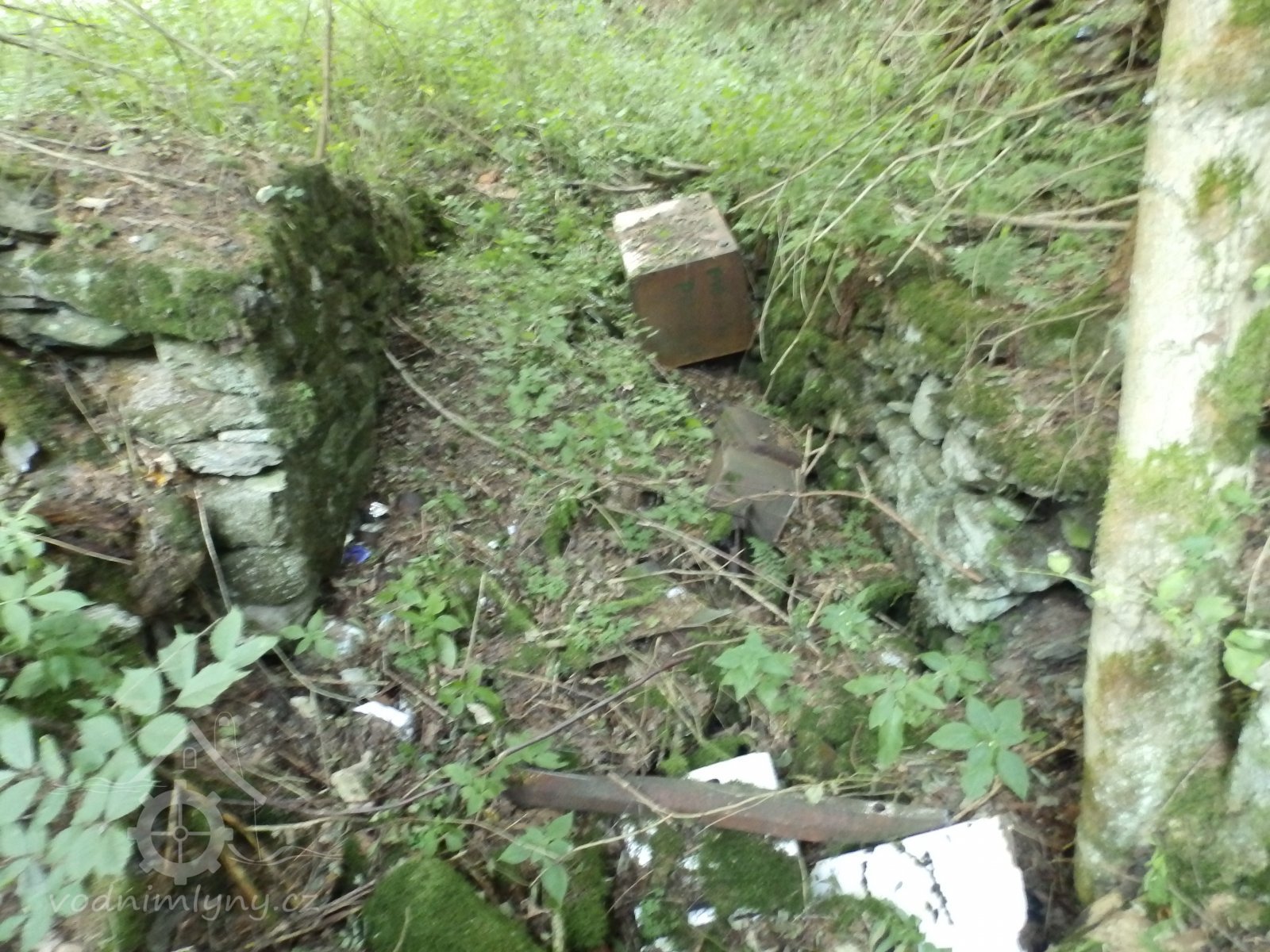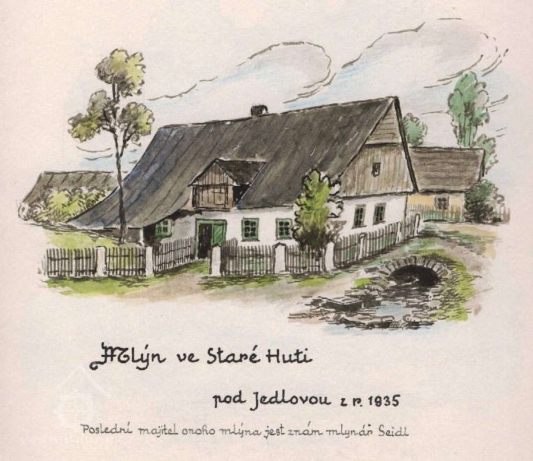 Rozlehlé zříceniny mlýna na soutoku Huťského potoka s potokem, přitékajícím od sv. Matouše. Mlýn je totožný s mlýnem,nazývaným v starších pramenech jako Buschmühle, doložený koncem 18. stol. v držení rodu Abelů. Mlelo se zde až do roku 1912, poslední majitel Frydolín Seidl ve mlýně zřídil pekárnu a obchod, později i tkalcovnu, v živnosti pak pokračovala jeho vdova. Syn Frydolín byl po válce odsunut, mlýn zůstal neobydlen a postupně chátral, až zcela zanikl.