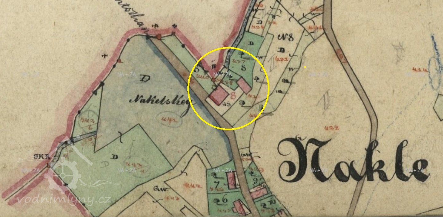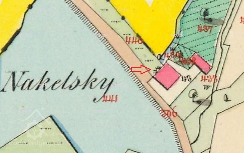Vodní kniha z roku 1874: mlýn o jednom složení s přistrkovací jahelkou, hnaným kolem na vrchní vodu o průměru 422 cm, šířce 55 cm. Majitel Fr. Pecold.