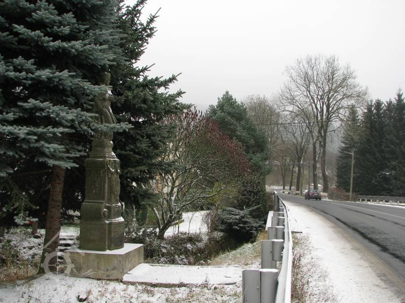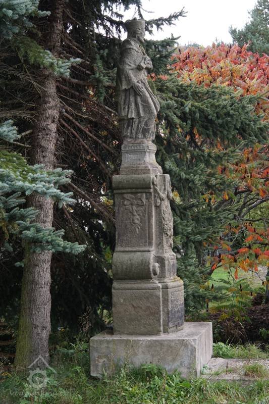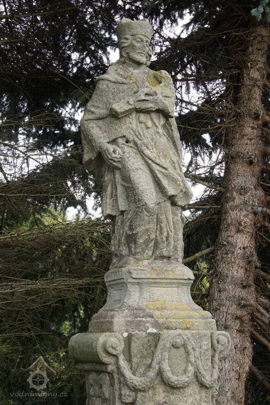 Socha světce Jana Nepomuckého v podživotní velikosti na tvarovaném třístupňovém hranolovém podstavci. Střední část podstavce po stranách doplněna volutami v horní části s girlandou. Svatý Jan Nepomucký v obvyklém ikonografickém pojetí s biretem na hlavě a krucixifem v náručí, v pravé ruce drží palmový list. Stopy případné polychromie nejsou zřejmé. Sokl v přední i zadní popsán textem, špatně čitelné. Socha provedena v klasicistním slohu.