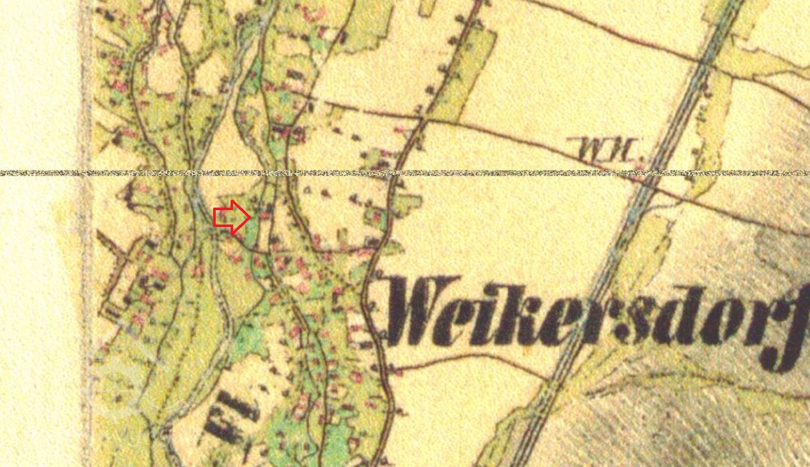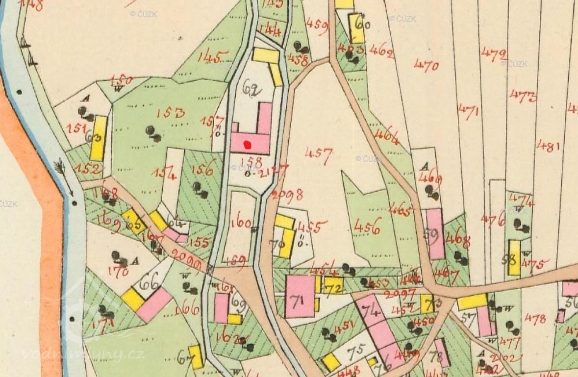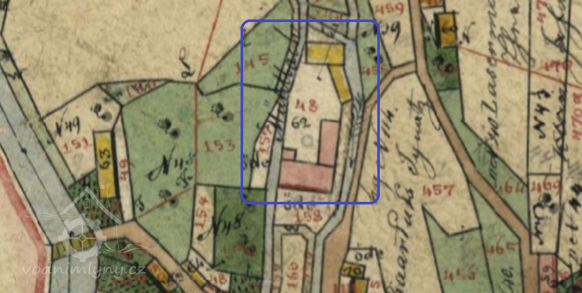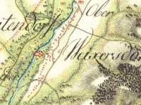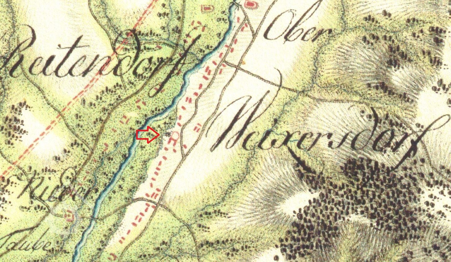 Mlýn dohledán na mapách I. vojenského mapování. (JV)