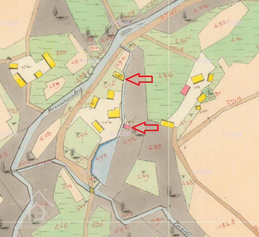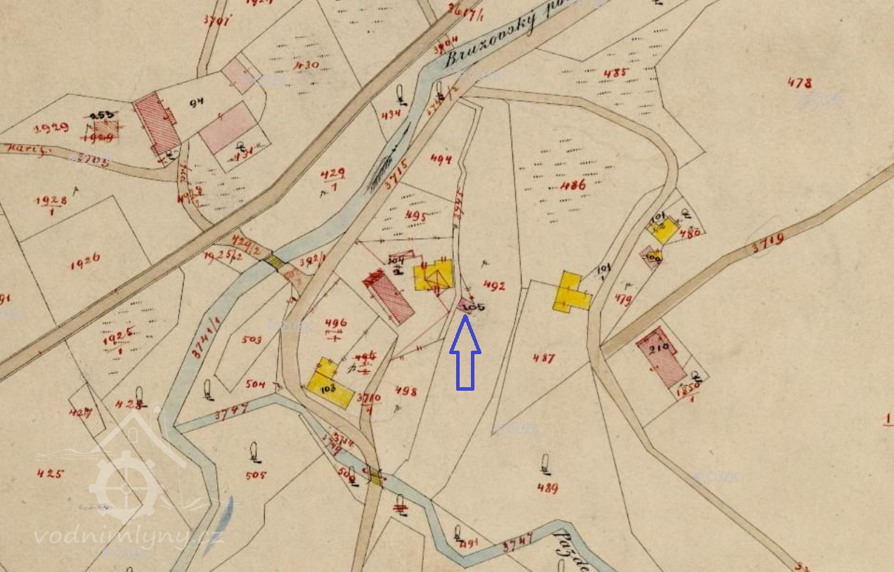 Nad vyústěním potoka Pazderna do Porumbčoku, byl na prvně jmenované vodoteči vybudován dle mapy menší dřevěný jez, který hnal vodu do pravostranného náhonu a na mlýn, a který zároveň sloužil jako mostek cesty z Pazderne do Žermanic a do areálu volenství. Hned za začátkem náhonu byl na něm vystavěn větší jímací rybníček s pč. 498, tak zvaný stav, ve kterém se v době sucha zachytávala a případně regulovala voda pouštěná shora na mlýnské vodní kolo.