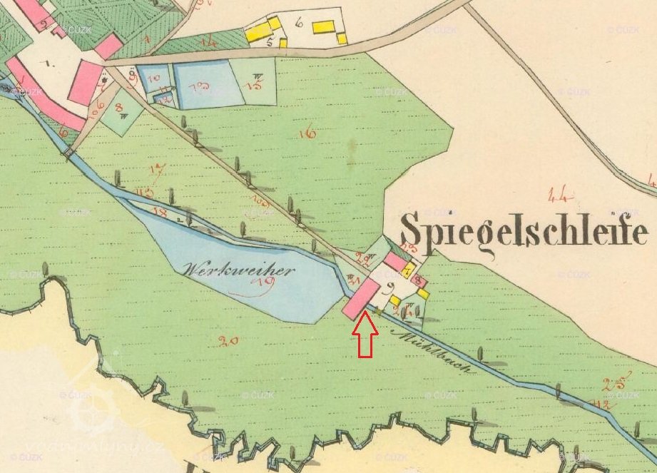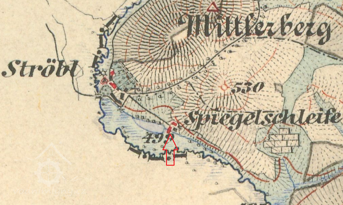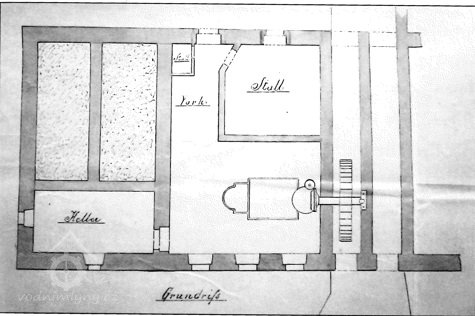 Popis1930 – 1 vodní kolo na střední vodu, hltnost 0,22 m3/s, spád 1,4 m, výkon 2,2 HP