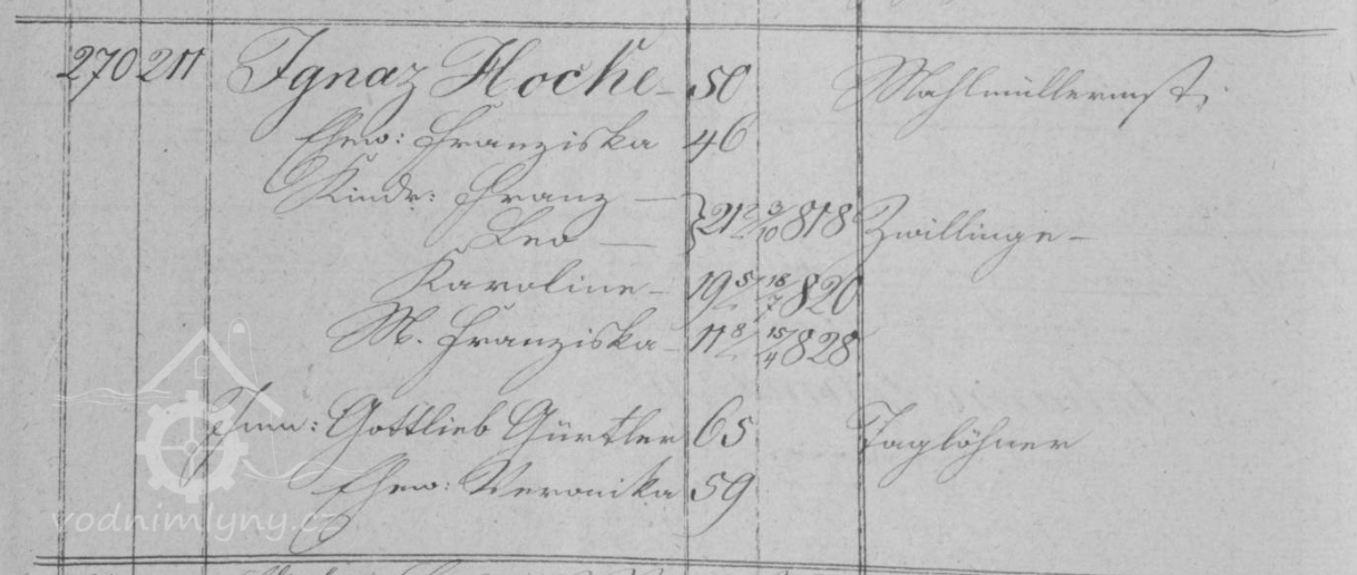 V roce 1808 vlastnil mlýn nový majitel, mlynář Franz Hocke s manželkou Rosinou a synem Ignazem. V té době měl mlýn již čp. 270. Po smrti Rosiny v roce 1816 se mlynář podruhé oženil. Jeho druhá manželka Barbara byla o 34 roků mladší.