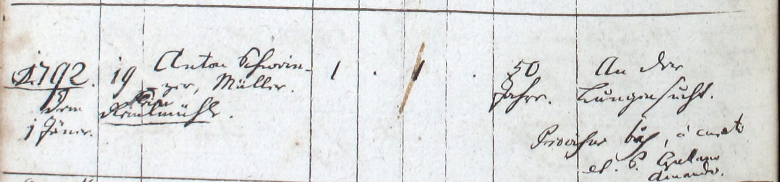 Prvním držitelem a provozovatelem byl Anton Schweinitzer, který se v roce 1769 oženil s Apollonií Görgl z Pístova. Z manželství vzešlé 3 děti (Maria Anna 1770, Johannes Josef 1773 a Johannes Kaspar 1775) zemřely v dětském věku, v roce 1777 zemřela i mlynářova manželka Apollonia. Dne 1. ledna 1792 zemřel ve věku 50 roků Anton Schweinitzer na souchotiny. V zápise o úmrtí je uváděn jako mlynář.
