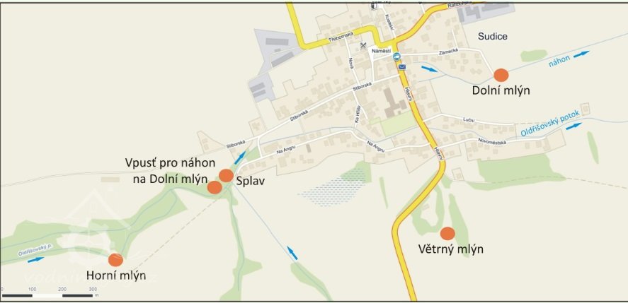 Přes obec Sudice byl zbudován Mlýnský potok nazývaný Mühlgraben, jako společné dílo Sudičanů, který vedl k "Dolnímu mlýnu" se splavem. Vody tekoucí z Mlýnského potoka i z Bílého potoka se za hranicemi vlévají do nedaleké říčky Pštiny a následně do řeky Odry. Majitelem Dolního mlýna, který stál v severovýchodní části obce, byl pan Alfred Swoboda. Pro mlynářské a hospodářské práce zde pracoval i odborný mlynář pan Werner pocházející ze střední Moravy. Mlýn měl v roce 1945 ještě i selské hospodářství s 5 ha půdy a 2 koně, jak se uvádí v obecní kronice. Při přechodu fronty za druhé světové války byl mlýn vypálen ruskými vojáky a tím zanikl. Na tomto místě je dnes postaven rodinný dům.