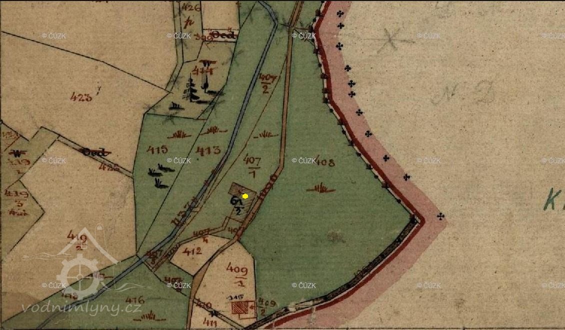 PopisV roce 1930 pohání mlýn kolo na svrchní vodu s průtokem 0.12 m3/s, spádem 3 m o výkonu 3 HP.