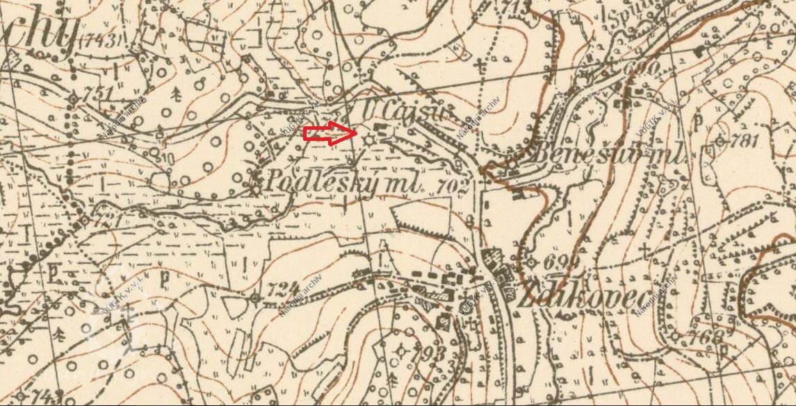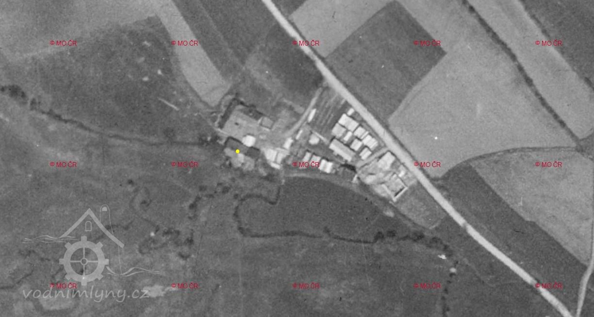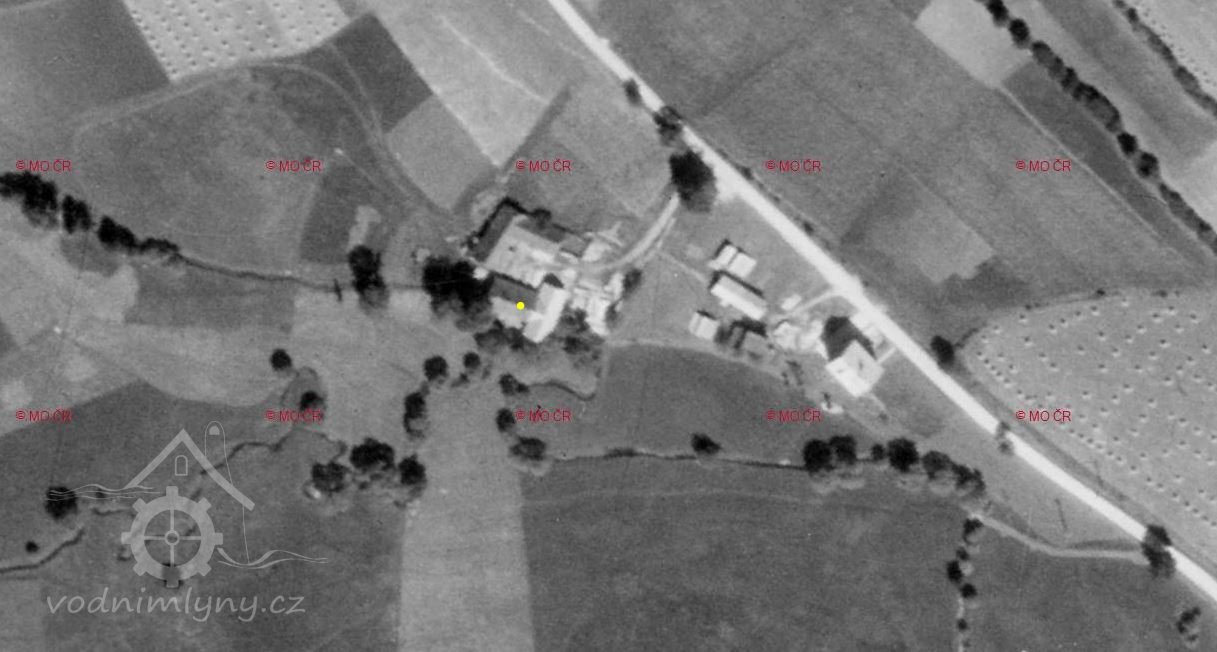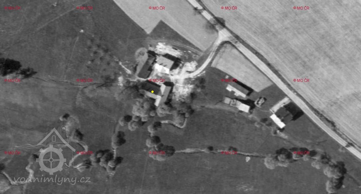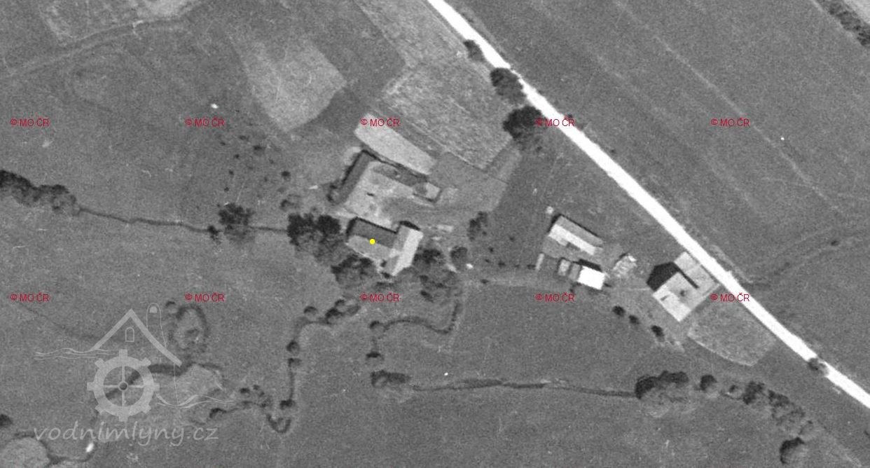 Novější mlýn s pilou, zbořený někdy po roce 1967 až na stodolu a pilnici.