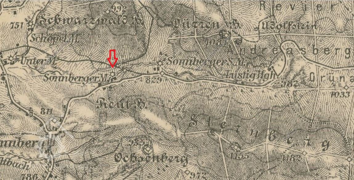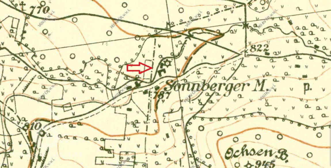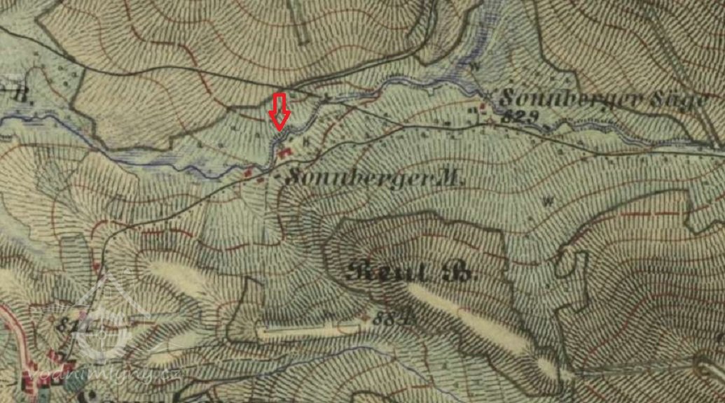 Mlýn se poprvé objevuje na mapě stabilního katastru jako dokreslená stavba, vznikl tedy zřejmě až ve druhé polovině 19. stol. stejně jako pila, která stávala cca 1 km dále proti proudu. Kolem roku 1880  je mlýn zakreslen jako Sonnberger Mühl.