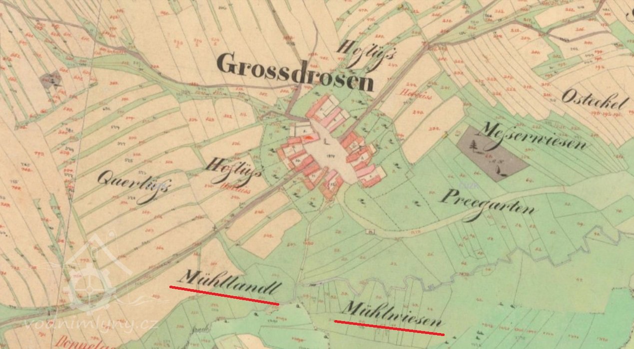 Již dávno zaniklý mlýn, dosvědčený jen jmény polních tratí Mühllandl a Mühlwiesen.