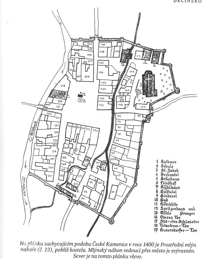 V 16. století severní hranici města Česká Kamenice tvořila řeka Kamenice. Kromě tohoto vodního toku procházel městem náhon, přivádějící potřebnou vodu. V té době v Kamenici pracovaly tři mlýny. Kromě Horního mlýna v Horní Kamenici stál pod Kostelním vrškem /kostel sv. Jakuba/ také Prostřední mlýn. Náhon pak pokračoval po jižní hraně tehdejšího Hrnčířského trhu a Mlýnskou uličkou až k Dolnímu mlýnu a dál do Dolní Kamenice.