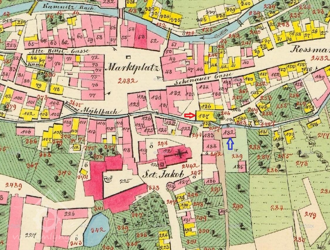Původní středověký mlýn uvnitř městských hradeb, poč. 19. stol. provoz přemístěn do volného prostoru těsně za městskou hradbou, po nějaký čas působily oba společně, následně však zde provoz zastaven.