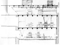v suterénu hlavní transmise, hlavy kapsových výtahů, loupačka a mačkadlo