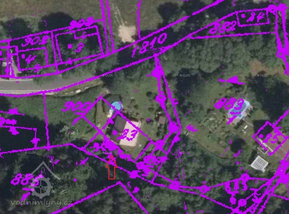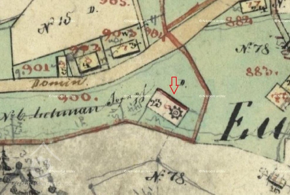 PopisVodní kniha 1874 - vodní kolo na vrchní vodu o průměru 7,82 m a šířce 0,3 m.