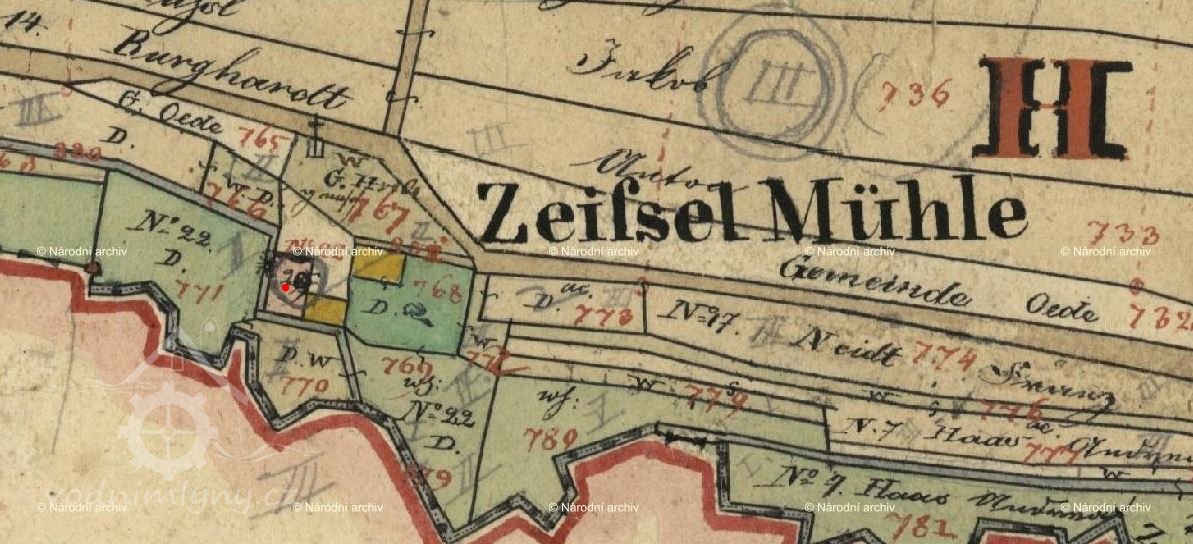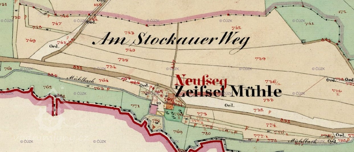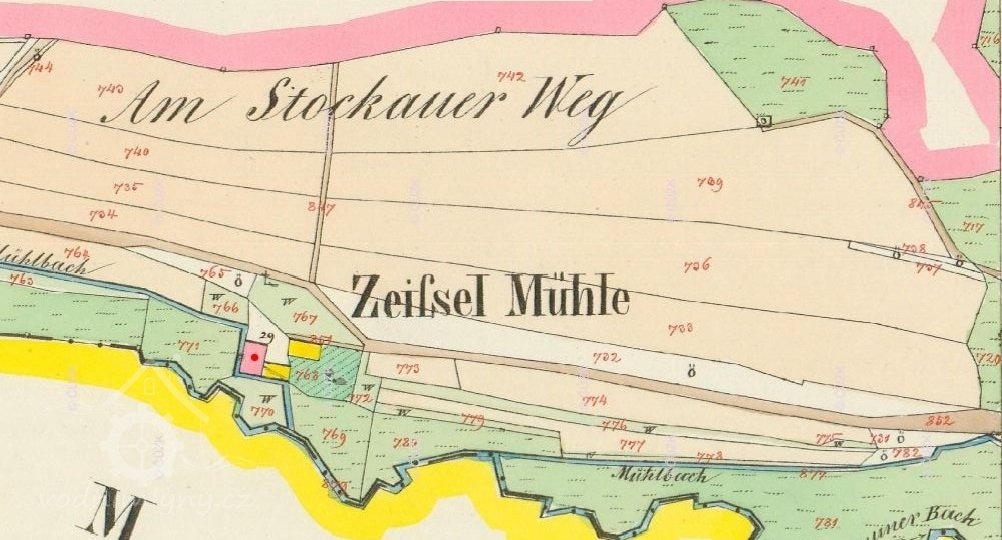 Původní název Zeifselmühle. Na I. vojenském mapování stavby zřetelné, symbol mlýna spíše nečitelný. Na II. vojenském mapování jako Schle MM. Na otisku i skice stabilního katastru je mlýn o jednom kole v nespalné budově a 2 spalné budovy, majitel Franz Beck. Postupně horní budova přeměněna na nespalnou. Někdy je v matrikách zaměňován za Poppelmühle, ale ten stával o kus dál mezi Mnichovem a Poběžovicemi.