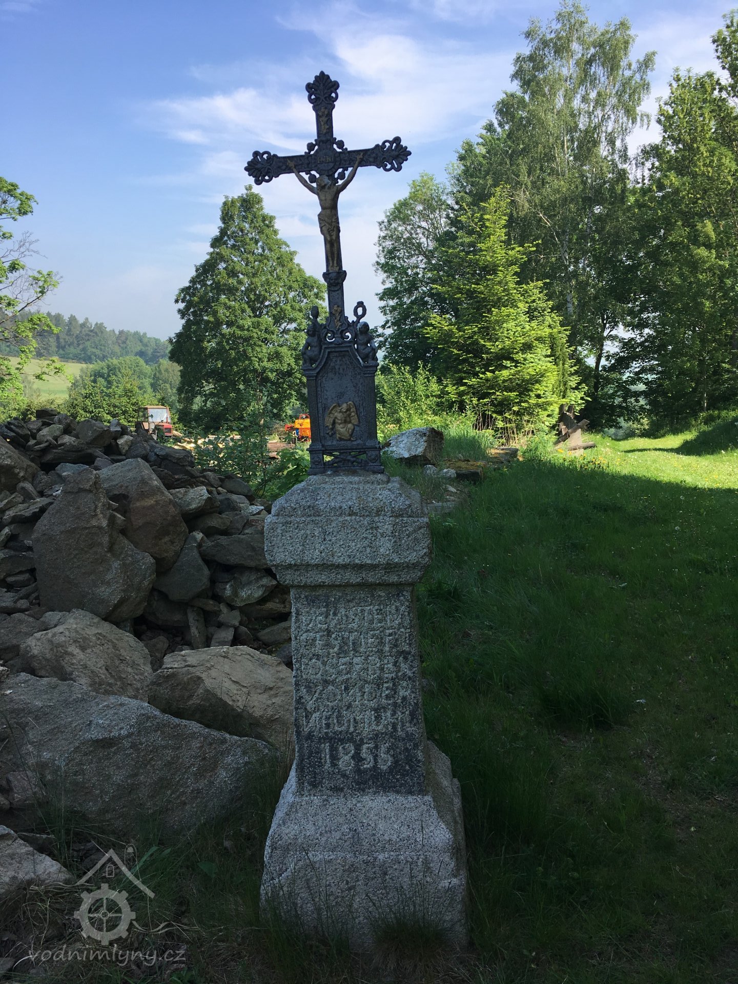 V blízkosti vstupu na hřbitov v Hoře Svatého Václava se nachází kamenný podstavec s litinovým křížem. Památník tam byl patrně převezen, neboť nápis se vztahuje k mlýnu Neumühle a nechal jej vytvořit mlynář Josef Beck. Ještě v 90. letech 20. století ležel podstavec povalen na zemi, litinový kříž byl odlomen. Vedle památníku ležel mlýnský kámen upravený jako základový kámen pro zasazení soklu. Hranolový pilíř s odstupněným soklem nese německý nápis. Text je rustikální s chybami, všechna N jsou psána stranově obráceně. Nápis na první straně podstavce: Den Stein gestiftet Josef Bek von der Neumuhl 1855. Druhá strana obsahuje náboženský text, na třetí straně je vyryto srdce s křížem a větévkami.