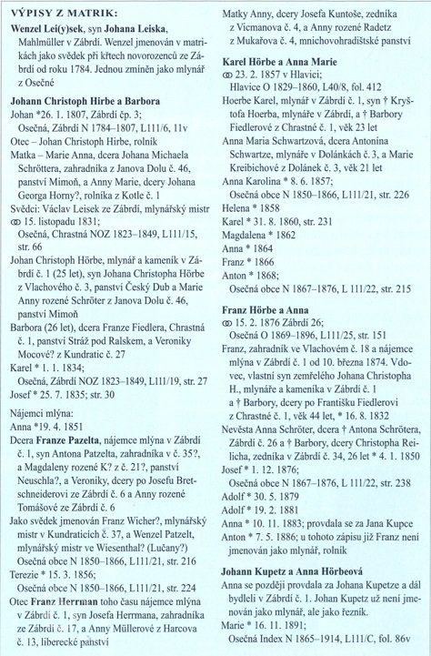 Dalším majitelem a mlynářem byl Johann Christoph Hirbe (Hörbe) z Vlachového čp. 3. Narodil se 26. ledna 1807 v rolnické rodině, v roce 1831 se oženil c Barborou Fiedlerovou z Chrastné. V zápise o sňatku se uváděn jako mlynář a kameník v Zábrdí čp. 1. V roce 1832 se jim narodil syn Franz, v roce 1834 syn Karel. Oba postupně převzali mlynářské řemeslo.