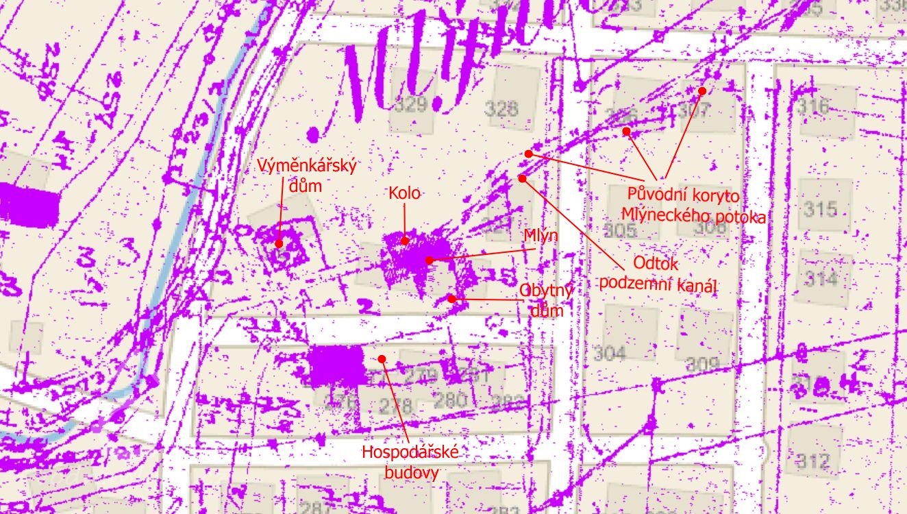 Asi okolo roku 1900 došlo z důvodů záplav k úpravě, přemístění koryta Mlýneckého potoka. Původně tekl potok okolo Dolního mlýna, ale po úpravě se potok ocitl asi padesát metrů vzdálený. Pro potřeby mlýna bylo ponecháno staré koryto a od mlýna byl vybudován asi 120 metrů dlouhý podzemní kanál.