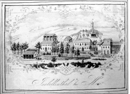 První zmínky o moučném mlýnu v Izabelině údolí se objevují až v roce 1872, rok po uzavření továrny na broky. Tehdy byla na náhonu při vodním provozu továrny postavena malá hrázděná budova označená jako mlýn. Byl upraven 50 m dlouhý jez, který zadržoval vodu pro mlýnský náhon.
