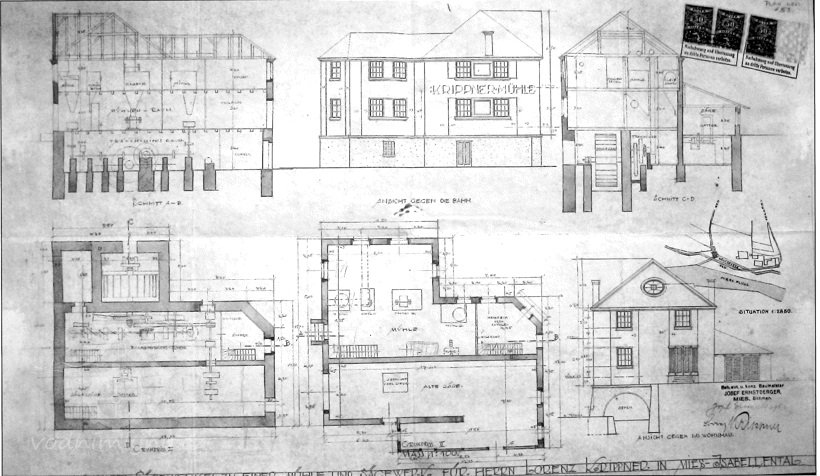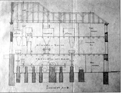 Rok 1921 - v suterénu byly transmise, v přízemí válcová mlecí stolice, francouzský kámen a loupačka, v patře a na půdě další vybavení.