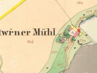 III. vojenské mapování - značka mlýna, pravděpodobně tu byla (s ohledem na lesnaté okolí) i pila, poháněná vodním pohonem.