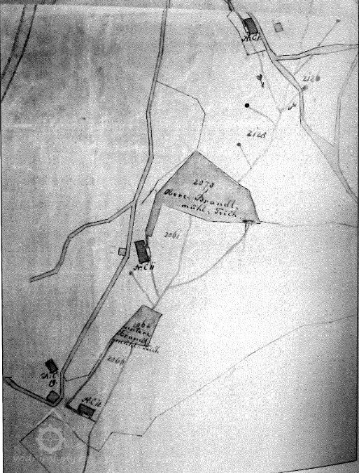 Sčítání obyvatel 1880 – mlýn byl rozdělen na 3 byty a byl v držení rodiny Schumaků, kteří byli i na sousedním Horním mlýně. Na prvním bytě byl uveden jako majitel Dolního Brandlova mlýna mlynář Josef Schumak (1850) s manželkou Barbarou a dětmi Josefem, Thomasem a Annou. Na druhém bytě žila výminkářka a matka mlynáře Dorothea Schumaková s dcerou Emmou Marií (narozena 1858). Na třetím bytě byl zapsán Karl Schumak (1846), který však nebyl přítomen, protože sloužil jako četník v Děčíně. U mlýna byli chovány 4 kusy hovězího dobytka, 2 voli a 3 prasata.