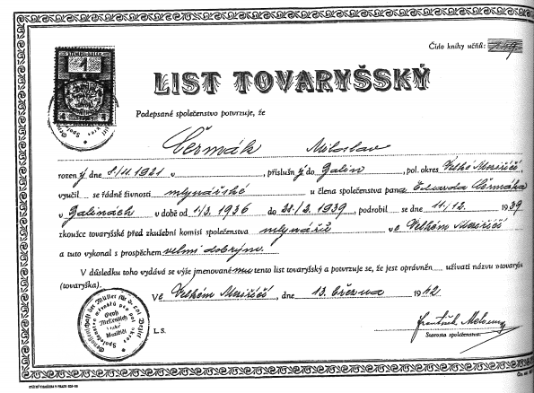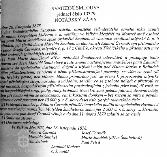3.8.1805 po otci převzal mlýn v ceně 4000 zl. Josef Čermák