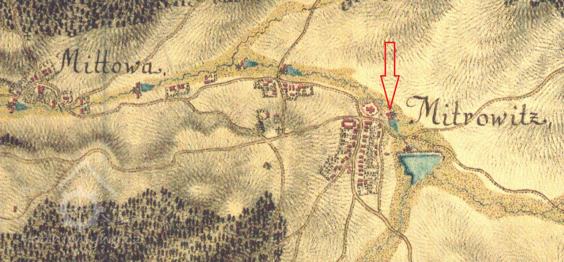 Původní dřevěný mlýn v Mitrovicích, ukončil činnost po pol. 19 stol., kdy jej postupně nahradil mlýn v čp. 83. Na originální mapě ke stabilnímu katastru vyznačen již jako zaniklá stavba. (Vendula Hnojská ho ale nezmiňuje.)