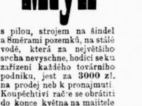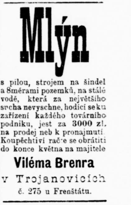 1894 Vilém Brenr, mlýn nabízen k prodeji za 3000 zl.