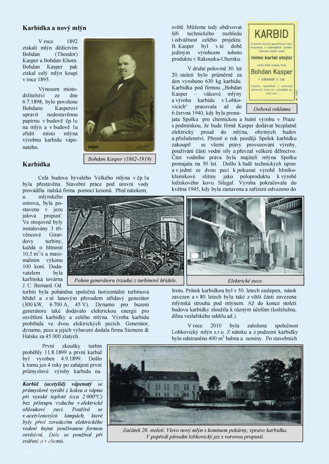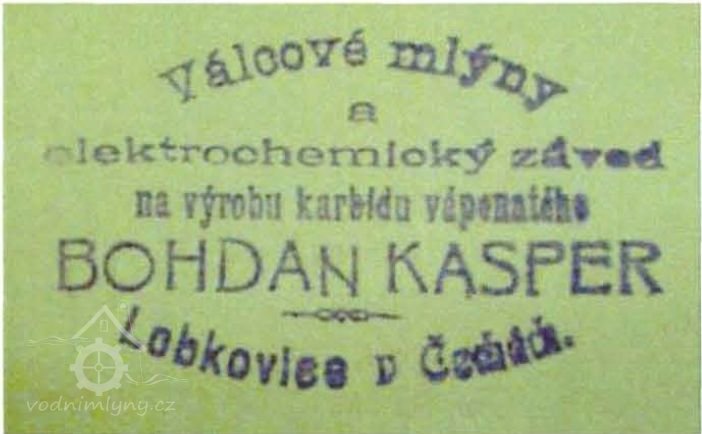 V roce 1892 získali mlýn dědictvím Bohdan (Theodor) Kasper a Bohdan Khom. Bohdan Kasper pak získal celý mlýn koupí v roce 1895. Výnosem místodržitelství ze dne 6.7.1898, bylo povoleno Bohdanu Kasperovi upravit nedostavěnou papírnu v budově čp. 1 c na mlýn a v budově 1 a zřídit místo mlýna výrobnu karbidu vápenatého. (Martin Čejka)